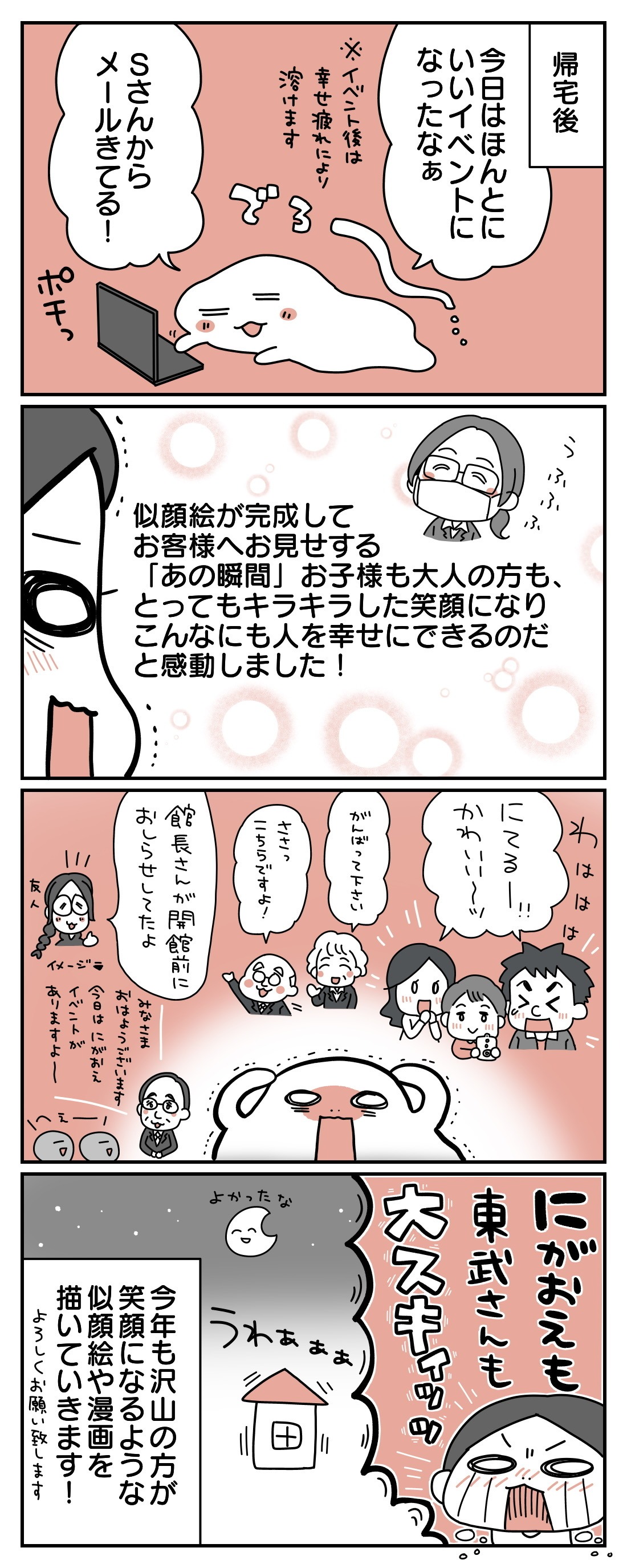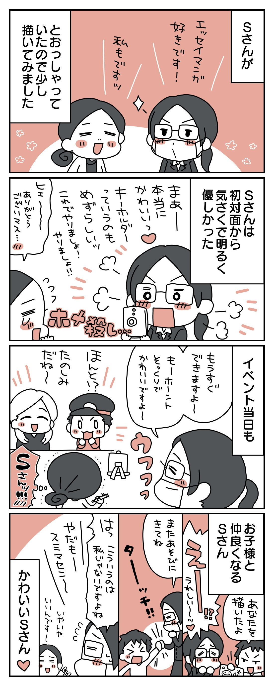 私が絵に集中している間も、お客様やお子様と楽しくお話をして待ち時間を素敵なひとときに変えてくださいました。絵が完成する時には一緒になって盛り上げてくださり、Sさんと共にイベントを作り上げていっているような気持ちでした。本当に本当にありがとうございます。
