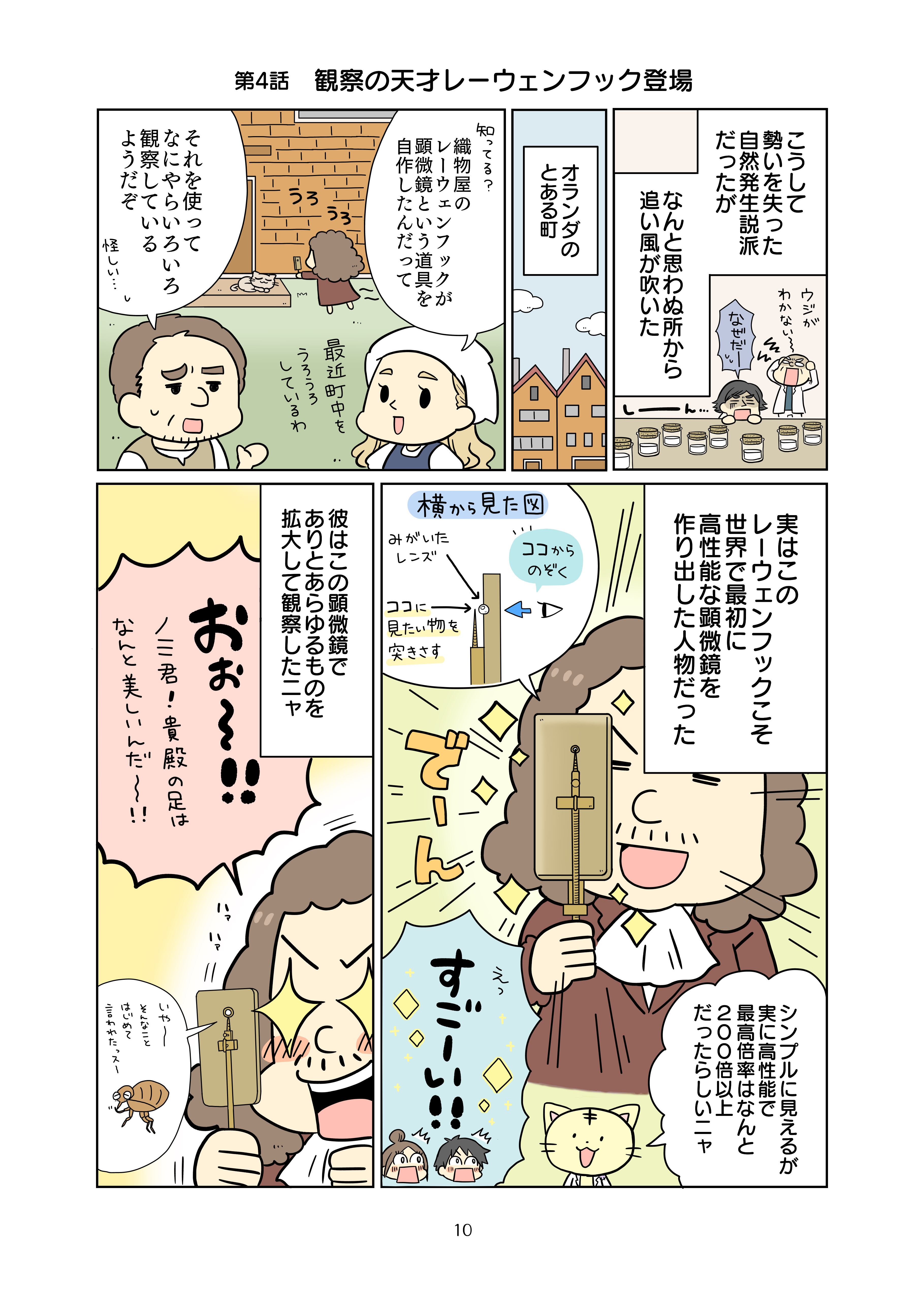 アリストテレスやレーウェンフック、コッホ、パスツールなど微生物学の黎明期を彩った科学者たちの人生を、ゆる〜いマンガでわかりやすく紹介!